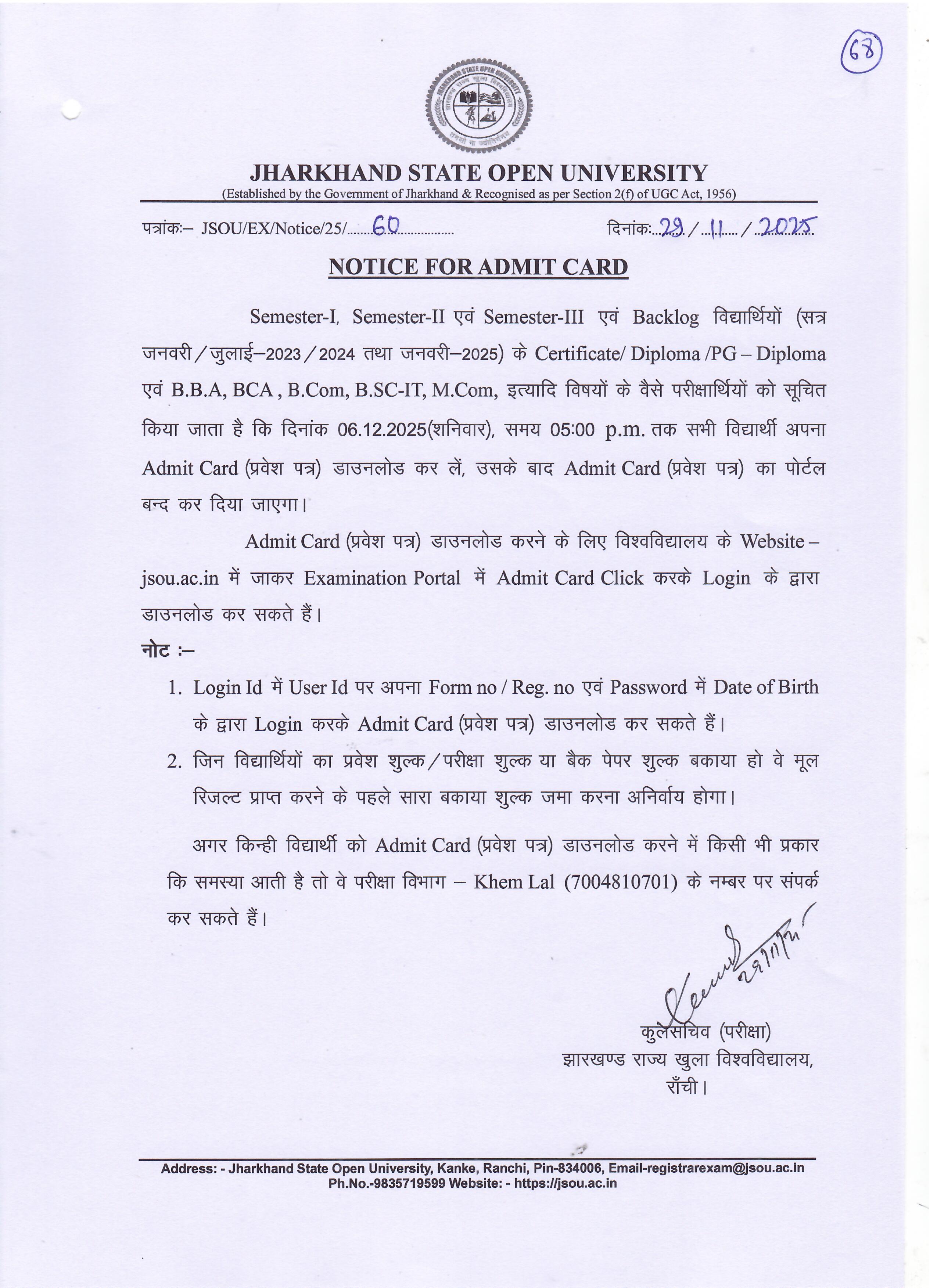 The Jharkhand State Open University, Ranchi has been established by the State Government of Jharkhand under the Jharkhand State Open University Act, 2021 (Jharkhand Act, 12, 2021) duly enacted by the Legislature of the State of Jharkhand and approved by the Hon'ble Governor, Jharkhand on 02.11.2021 for the introduction and promotion of Open University and distance education system in the educational pattern of the Jharkhand State and to provide educational opportunities to those who are unable to go in formal...